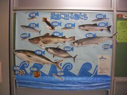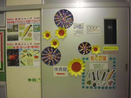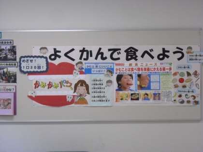 3日(水)から、給食が始まりました。栄養士を中心に食育に関する掲示物を作成しました。7月は「噛むことの大切さ」と、夏に旬を迎える野菜を紹介しましたが、9月は、普段切り身でしか見たことのない魚を実物大で紹介しています。今学期も楽しんで食べてもらいたいです。