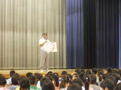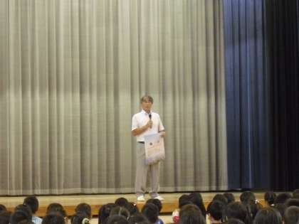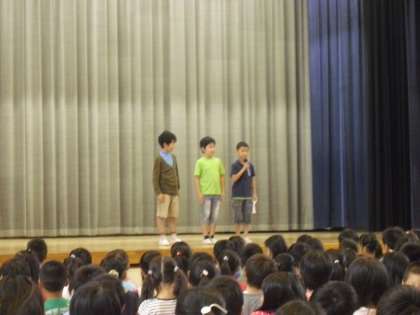 2学期最初の全校朝会は雨のため、体育館で行いました。最初に校長先生から、本日8日は24節気の「白露」であること、「人格の完成をめざして」の9月の目標が「勇気」であることの話がありました。全米テニス大会で決勝に進出した日本人選手の話に子どもたちも「知ってる」とうなずきながら聞いていました。次に、あいさつキャンペーンがありました。今週は、4年1組が担当です。3人の男の子が全校児童に向けて「あいさつは友達だけではなく、地域の方にもしましょう。」と呼びかけていました。