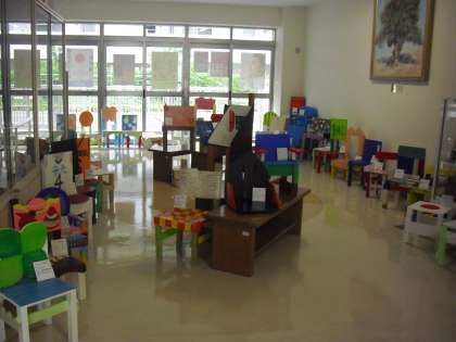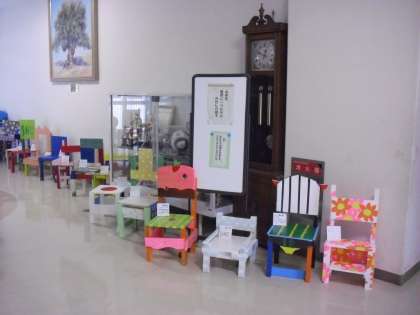 6年生が1学期の終わりにつくっていた「世界に一つだけのわたしのいす」を2カ所に分けて展示しています。一つは、玄関のホール、もう一つは保健室手前の小さなホールです。同じ材料でつくり始めましたが、つくる人によって、形も色も違っています。色合いやバランスの取り方などとてもすてきです。学校にお越しの際は、是非ご覧ください。