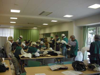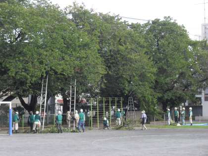 本校では毎年緑友会(りょくゆうかい)の皆様のご厚意により、樹木の剪定をしていただいています。今年もその季節になりました。多目的室を控え室にして、打ち合わせ、ストレッチをしたあと、校舎北側の通用門周辺から仕事が始まりました。高いところははしごを延ばし、太い幹ものこぎりで難なく切っていました。緑友会の皆様には、明日もお世話になります。