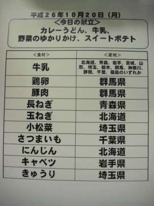 10月20日(月)の給食食材産地について
