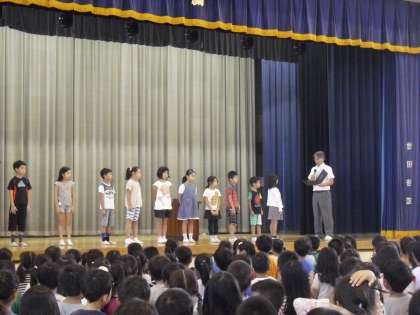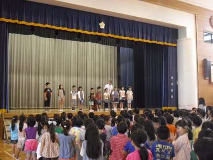 毎年1・2・3年生の全員が「歯磨きポスター展」に参加しています。今年度は、11名の作品に対して賞をいただきました。9月に区民会館2階の集会室で表彰式があり、他校の子どもたちと一緒に賞を受け取りましたが、全校朝会でも改めて表彰しました。ポスターを描くことで自分の歯の大切さに気付いたと思います。