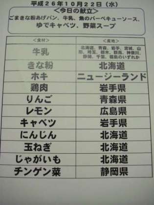 10月22日(水)の給食食材産地について