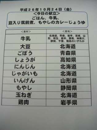10月24日(金)の給食食材産地について