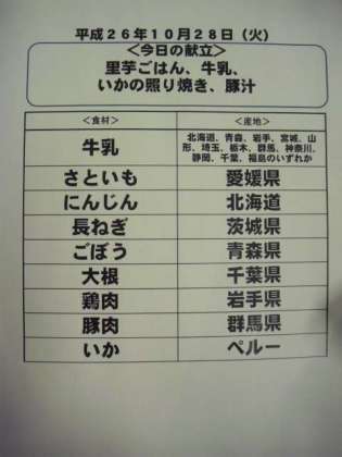 10月28日(火)給食食材産地について