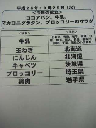 10月29日(水)の給食食材産地について