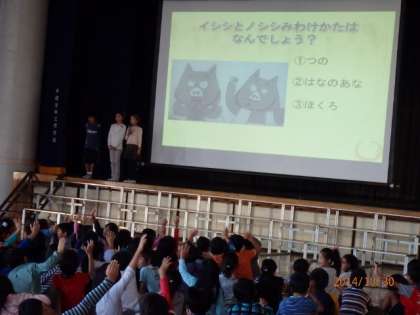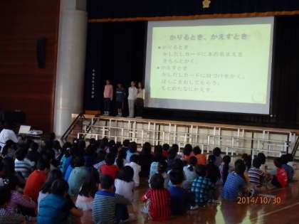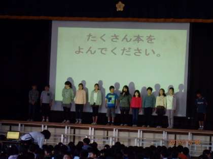 今日の児童集会は、図書委員会の発表でした。発表の中で、学校の図書館には11,811冊の本がありますが、129冊返却されていないという報告もありました。物を大切にしない子どもたちの様子がここにも現われています。最後に、子どもたちに人気の本についてのクイズがあり、喜んで手を挙げていました。