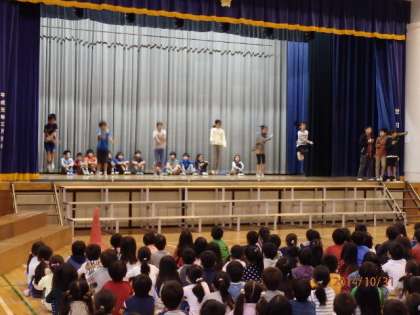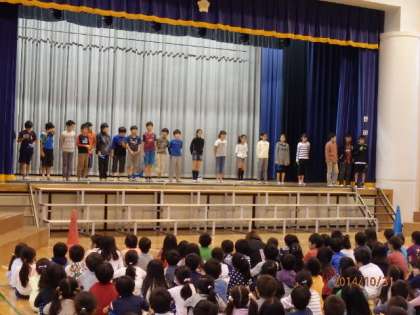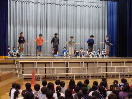 運動委員会の皆さんが来週の4日から始まるなわとび月間について、説明しました。また、なわとびの跳び方も披露してくれました。はやぶさ跳び、三重跳びには、子どもたちから自然と拍手が湧きました。短い練習しかできなかったようですが、それぞれの跳び方を紹介できました。なわとび月間は、4日(火)から28日(金)までで、火曜日の中休み、金曜日のわくわくスポーツタイムのときに行われます。