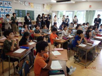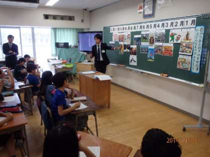 単元は「日本の四季・年中行事」でした。年中行事の写真をたくさん用意し、年中行事の秘密につながる子どもたちへの言葉かけも多く、しっかり準備された授業でした。子どもたちも先生を助けようとして、いつも以上に授業に集中していました。3年生らしい姿に他校の先生方から、お褒めの言葉をいただきました。