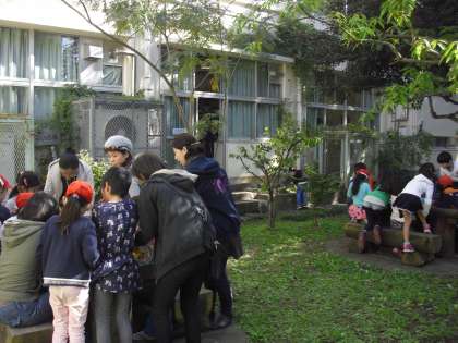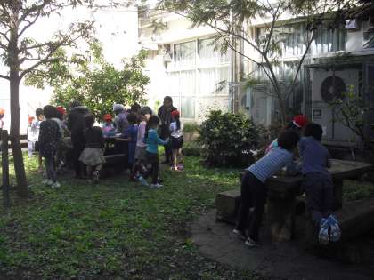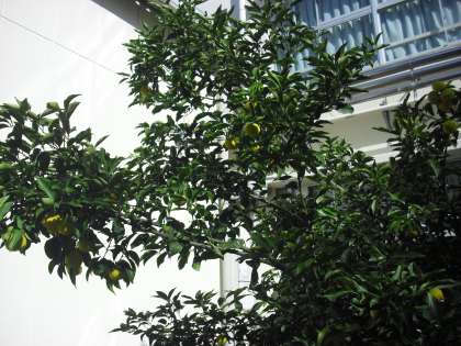 毎週金曜日の中休みだけ、ビオトープ周辺を開放しています。低学年の子どもたちを中心にクロメダカの観察や虫探しをしています。ここ最近の人気は、草花の押し花です。色付いた落ち葉や小さな花を1週間押し花にして、ボランティアのお母様方にラミネートしていただいています。完成品を手にした子どもたちはとてもうれしそうです。作業しているすぐ近くでは、ゆずが黄色く色付いていました。