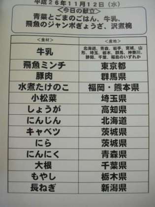 11月12日(水)の給食食材産地について