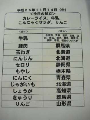 11月14日(金)の給食食材産地について