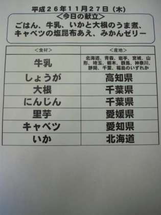 11月27日(木)の給食食材産地について
