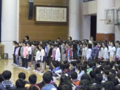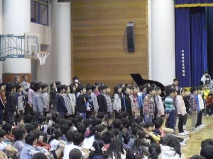 学年ごとに歌い終わると、6年生の男子が2人前に出て、1人ずつ歌ってくれました。声が変わりつつある中でもきれいな声を出そうとしたり、ことばを大切にした歌い方をしたりして自分に合った歌い方をしていました。写真は、3年、4年、5年生です。