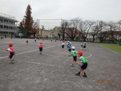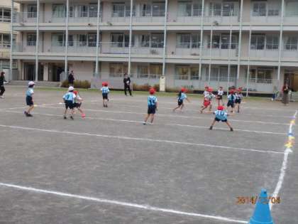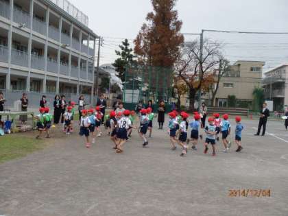 校内研究授業の5回目、1年が10月の2年に続いて、「鬼遊び」の授業を行いました。子どもたちは授業が始まる前から、今か今かと待ち遠しい様子でした。初めは準備運動を兼ねたリズム運動でしたが、難しい動きをよく覚え、先生の言うポイントをよく聞き、元気一杯に楽しんでいました。続いて、地蔵鬼。そして、今日のメインの宝とり鬼と進みました。残念ながら、授業を始めて30分ぐらいに雨が降ってきてしまいましたので、第1ゲームで授業は終了。途中で終了を知ると、子どもたちの「えーっ!」という声が上がりました。子どもたちにとっては残念でしたが、「えーっ!」という声で今日の授業は、大成功だと分かりました。