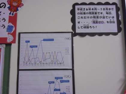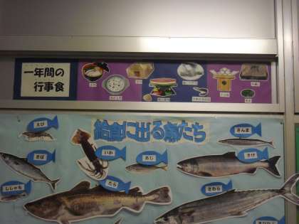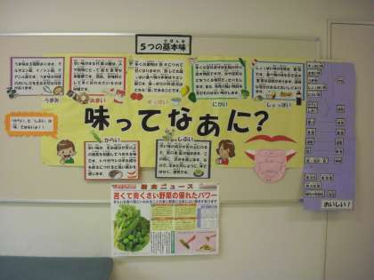 毎日の給食をおいしく食べてもらいたいと栄養士を中心に、ろう下の掲示にも工夫をしています。2階のギャラリーには「味覚」を取り上げた掲示物が登場しました。また、給食室前には、日本の年中行事で出される食事の紹介や毎月の残菜調査結果を掲示しています。