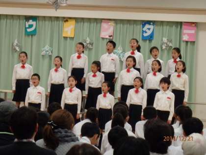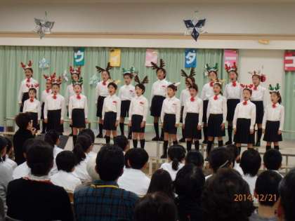 写真は、全員による「We wish you a merry christmas」、3年「赤鼻のトナカイ」、4年モチモチの木より「大きな木」の様子です。