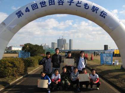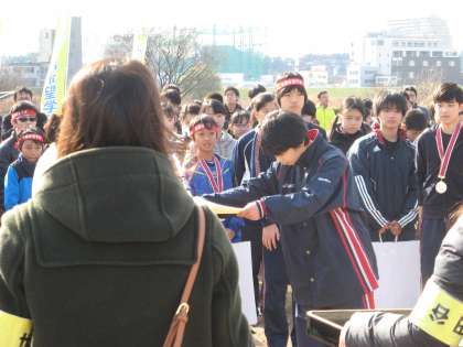 小・中学生の部は、52チームがエントリーをしていました。その中で「チーム赤松」は、初出場ながら4位になり入賞しました。表彰式では、代表の中学生が賞状を受け取りました。写真は、スタート前の様子、表彰式、襷をつないだ10人の選手達です。