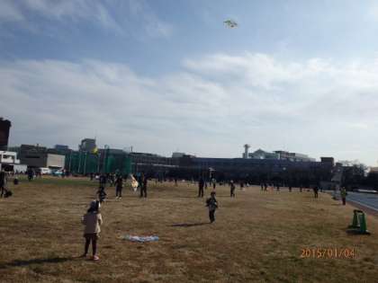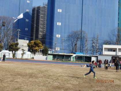 さて、1月4日に日本大学文理学部陸上グラウンドにおいて、青少年松沢地区委員会主催の「凧あげ大会」が開催されました。日曜日ということもあり、お父さんもたくさん参加していました。凧持込み自由でしたが、当日凧を作ってからあげる親子もいました。本校卒業生のジュニアリーダーも手伝いに来ていました。当日はいい天気でしたが、風がなく、走り回って凧あげしている子がたくさんいました。