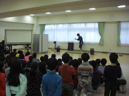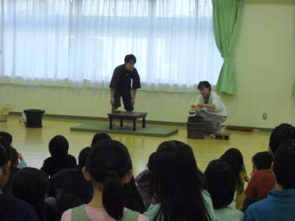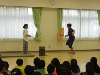3年生は、学年で「昔の生活」についての1時間目を学習していました。担任二人が母親と息子役になり、生活の様子を劇仕立てにして見せました。着物にぞうり、洗濯板、ちゃぶ台、たたみなどが使われ、子どもたちは今の生活との違いを探していました。子どもたちは、担任の変身振りに驚きながらもよく観察していました。