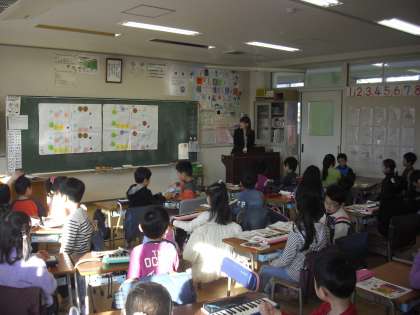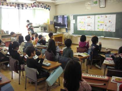 14日(水)の1時間目、1年1組の教室に特別支援学校のお友達が来てくれました。交換授業の時間でしたので、3組の担任と一緒に音楽の勉強をしました。手をたたいてリズムをとったり、体を動かしたりして一緒に楽しみました。お別れするときは、玄関まで見送り、「またね。」を手を振りました。