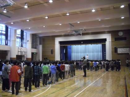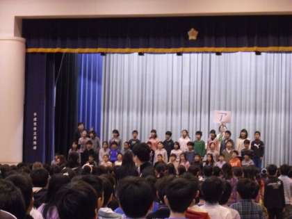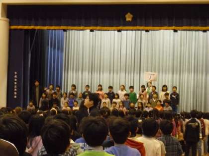 22日(木)は体育館で音楽朝会がありました。今回は12月に引き続き、「心から心へ」の歌を歌いました。この歌は6年生が学習発表会の劇中で披露したものです。「君の手とぼくの手を固くにぎり、分け合おうぼくたちの心のぬくもりを〜」と歌っていきますが、魔女達の歌と同時に対抗するように歌います。そこで今回4年2組の子ども達が立候補して魔女達の歌を歌うことになりました。41人の魔女対475人の子ども達でしたが、元気な声が体育館に響きわたりました。