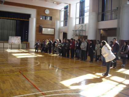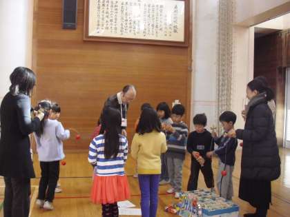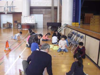 地域にお住まいの40名の方々がお越しくださり、体育館、生活科室で遊びを教えていただきました。グループごとに15分間ずつ3つの遊びを体験しました。写真は、はじめの会、けん玉コーナー、だるま落としコーナーの様子です。