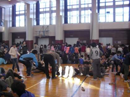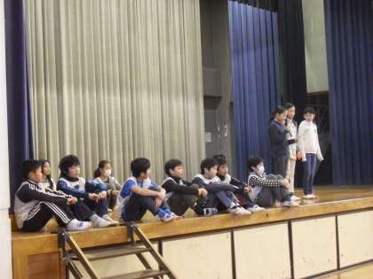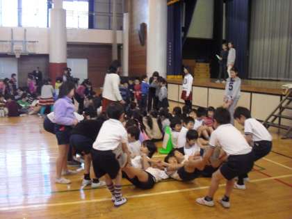 29日(木)の朝は、体育館で集会委員会による「大根ぬきゲーム」が行われました。クラスのみんなで腕を組み、丸くなってすわります。笛の合図でビブスを着けた集会委員が、すわっている子どもたちの両足首を持って引っ張ります。引っ張り出された子どもたちは集会委員とともに他の子どもたちをぬきにかかります。体育館中、子どもたちの元気な声が響きわたりました。