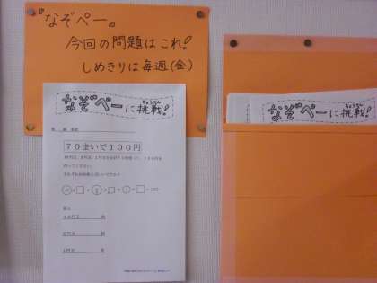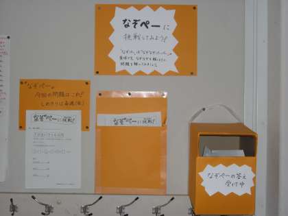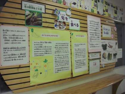 図書室前の廊下に「旬を食べる」と題して、冬の野菜ナンバー1の大根が紹介されています。特に大根の「からみ成分」について取り上げられていて、休み時間など子どもたちも足をとめて記事を読んでいます。また、3階少人数教室前の廊下に「なぞペー」が登場し、子どもたちの人気となっています。「なぞなぞペーパー」を略した「なぞペー」は毎週算数に関連する問題が出題されます。正解者の名前がはり出されるので、子どもたちもうれしいようです。