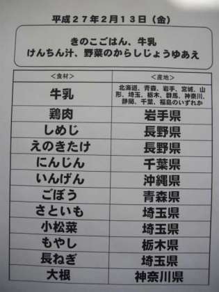 2月13日(金)の給食食材産地について