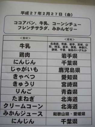 2月27日(金)の給食食材産地について