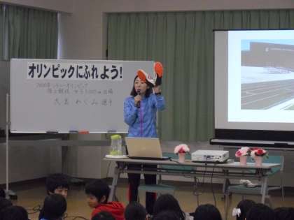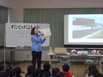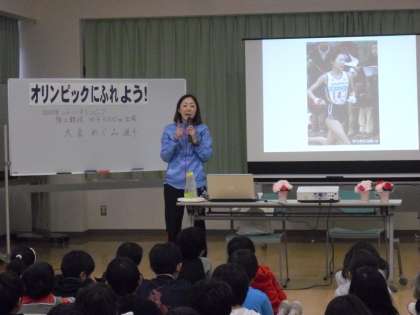 10日(水)、本校にとってお二人目となるオリンピアンが来校されました。シドニーオリンピック、アテネオリンピックで陸上競技女子5000mに出場された大島めぐみ選手です。今回は、4年生対象に映像を交えながら、たくさんのお話をしてくださいました。「継続することが大事である。」「成果を自分で確かめるために記録をつけること。」「大きな目標と小さな目標の2つを立てるとよい。」などです。実際に使っていたシューズや記録ノートなどを見せてくださり、子どもたちもうなずきながら聞いていました。