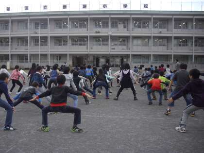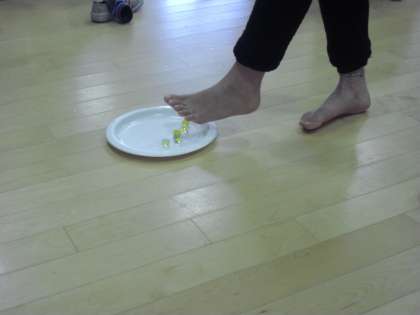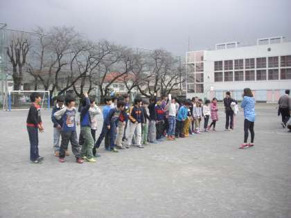 大島選手のお話のあと、多目的室内でくつ下をぬいでのビー玉運びをリレー方式で行いました。足でしっかり地面をつかんで走ることが大事だということから、この練習を紹介してくださいました。簡単そうに見えて結構難しいようでした。後半は、校庭に出て大島選手といっしょに走りました。クラスごとに校庭を5周しました。