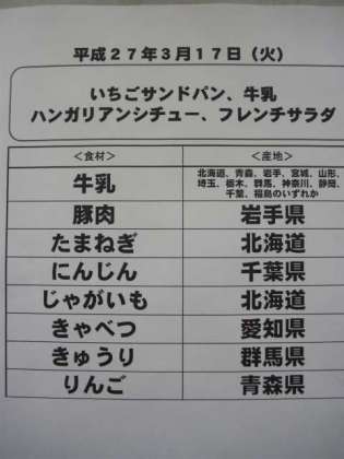 3月17日(火)の給食食材産地について