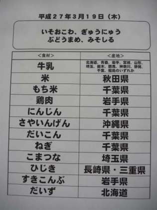 3月19日(木)の給食食材産地について
