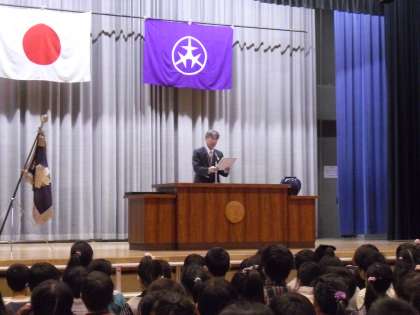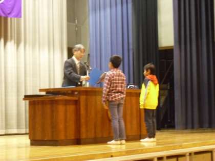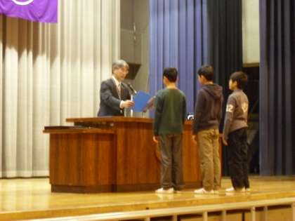 24日(火)体育館で1年の締めくくりとなる修了式が行われました。まず修了証の授与が学年ごとにありました。各クラスから1名が代表となり、校長先生から一人ずつ受け取りました。その後、校長先生よりお話がありました。