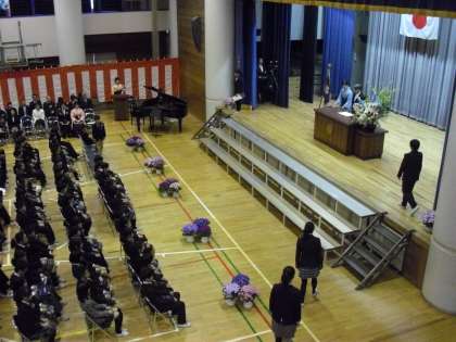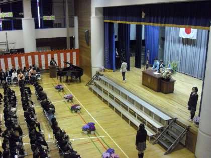 卒業式に向けて、6年生は入退場、証書の受け取り方、お辞儀の作法などの練習を重ねてきました。本番では緊張しながらも普段の練習通りにできました。お祝いのことば、来賓祝辞、祝電披露と進み、「門出のことば」になりました。写真は、2組の様子、3組の様子、そして5年生と向かい合っての「門出のことば」の様子です。