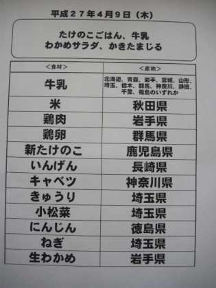 4月9日(木)の給食食材産地について