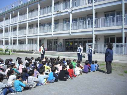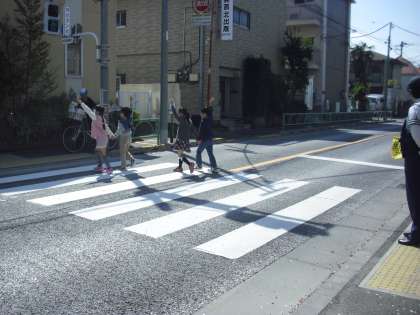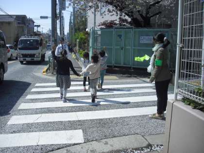 15日(水)の2時間目、1年生が交通安全教室に参加しました。北沢警察署、PTA校外委員会の皆さまのご協力により、横断歩道を渡る訓練を行いました。青になってもすぐに渡らず左右を確認して、手を挙げて渡ることを警察官、保護者の方たちに念押しされました。信号のない横断歩道で左右の確認をせず行こうとする姿があり、この点は今後も注意をしていきたいところです。