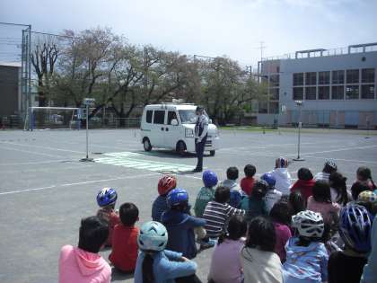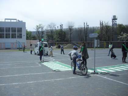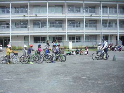 3年生は順番に一人ずつ自転車に乗り、きめられたコースを走りました。途中一時停止があったり、路上駐車の車をよけたりすることもしました。自転車は左側から乗ること、右足のペダルを高く上げて漕ぎだすことなども一人ずつ確認しました。訓練の最後に、「車のウィンカーを見ること」のお話がありました。