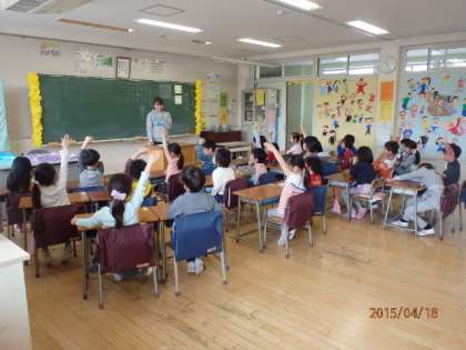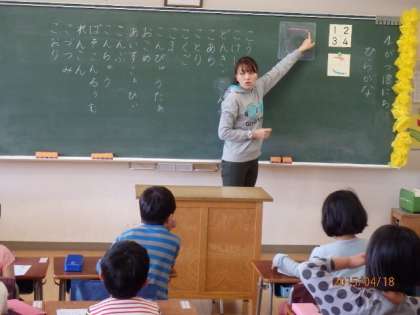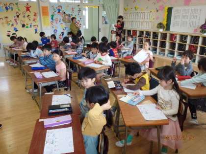 今日の授業は、ひらがな「こ」の練習でした。一マスの中の四つの部屋に気を付け、練習しています。子どもの発表に対し、先生から「花丸だね。」と言われ、子どもたちは、とてもうれしそうでした。プリントの表は学校で学習し、裏は宿題にしています。