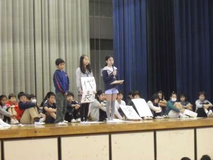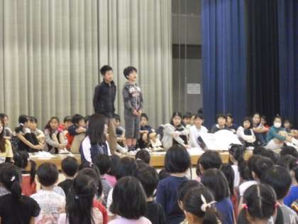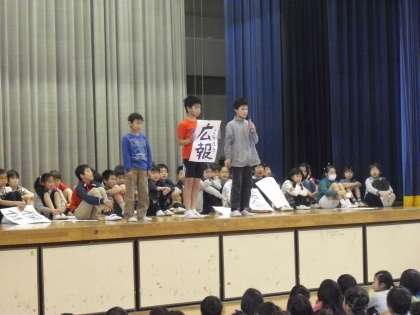 23日(木)の朝は、体育館で委員会活動の紹介が行われました。委員会活動は5・6年生で組織され、月1回話し合いを行いながら、学校全体に目を向けた活動をしています。代表委員会だけは4年生も参加しています。司会進行は、集会委員の6年生が行いました。委員長、副委員長2人の3人がステージに立ち、委員会の紹介やみんなへのお願いなどを話しました。写真は、司会によるあいさつ、代表委員会、広報委員会の様子です。
