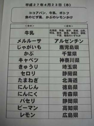 4月23日(木)の給食食材産地について