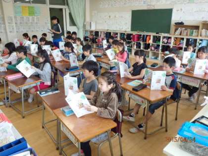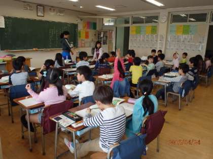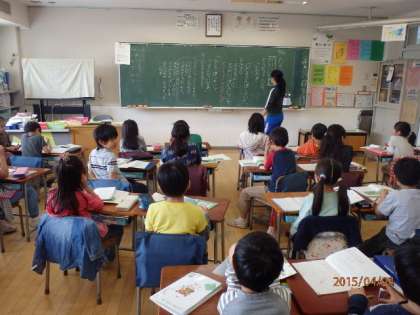 今日の授業は、「たろうのともだち」の第1場面についての学習でした。音読は、両足の裏をしっかりつけ、両手で本をしっかり持つよう指導されていました。子どもたちは、皆集中して先生の話をよく聞いていました。みんなに聞こえるように後ろを向いて発表し、ほかの子はハンドサインで、意思表示をしていました。