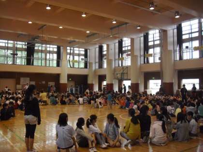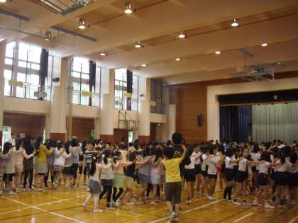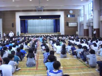 大型連休明けの7日(木)の朝は、体育館で児童集会が行われました。今回は、集会委員会による「じゃんけん列車」でした。ルール説明のあと、学年に関係なくじゃんけんが行われ、列がだんだん長くなっていきました。時間になったところでゲームは終了し、その場にすわりました。各列車の先頭の子がその場に立ち、みんなから拍手をもらいました。