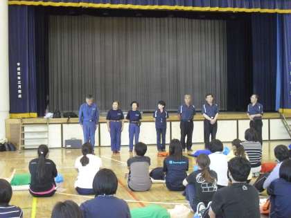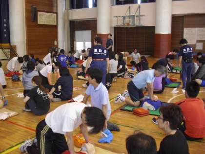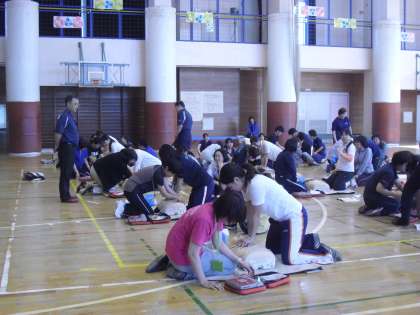 11日(月)の午後、体育館で教職員対象の「救命救急法訓練」が行われました。今回は、松沢小学校の先生方も参加し、58名が訓練に臨みました。消防署の方、消防団の方のご指導を受けながら、心肺蘇生やAEDによる除細動について実習を行いました。教職員は、水泳指導が始まる前に毎年訓練を行っています。今年度も事故のないよう気をつけてまいります。