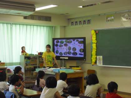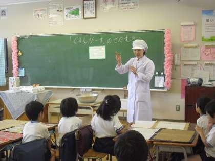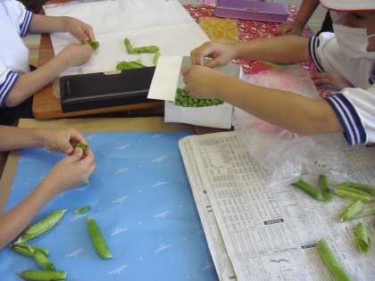 13日(水)の1時間目、1年生がグリンピースのさやむき体験を行いました。栄養士が各クラスをまわり、さやのむき方を指導しました。待っている間、他のクラスは担任が「豆」に関するお話を読んで聞かせるなどしていました。子どもたちは手を洗い、マスクをしてむいていきました。その日の給食に「グリンピースご飯」として出され、お昼の放送で1年生が活躍したことも紹介されました。