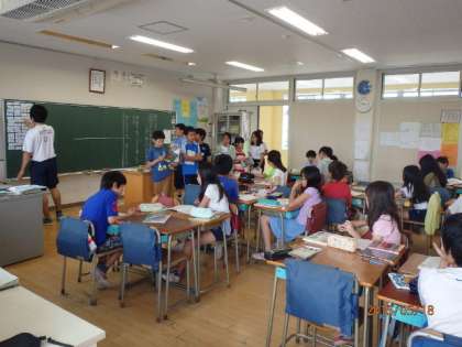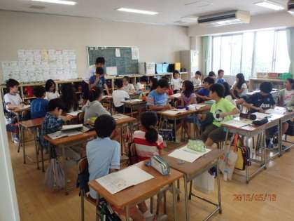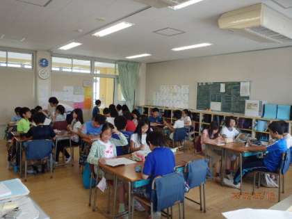 今日の授業は、「カニモトくん」でした。今日のめあては、日記を友達と紹介し合い、続きの話を考えようです。先生は発表者の後ろに立ち、子どもたちが発表者に向くよう、工夫していました。個人の考えをグループで紹介し合った後、グループの代表が全体に「似ているところ」「違っているところ」を発表しました。さて、子どもたちはどんな日記の続きを書くのでしょうか。