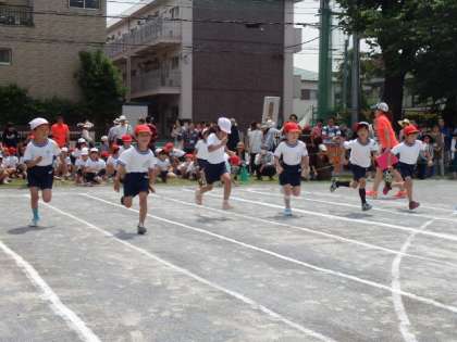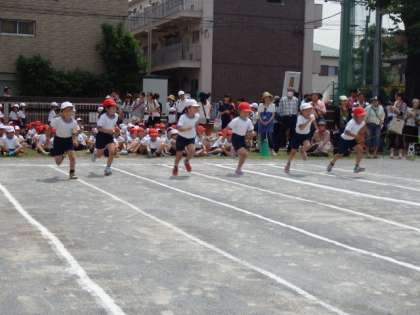 二度目の運動会です。子どもたちは、さすが落ち着いた表情で並び、昨年以上の速さでゴールめざして走り切っていました。