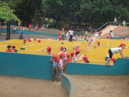 写真は、迷路の遊び場、昼食、丘の上広場の様子です。